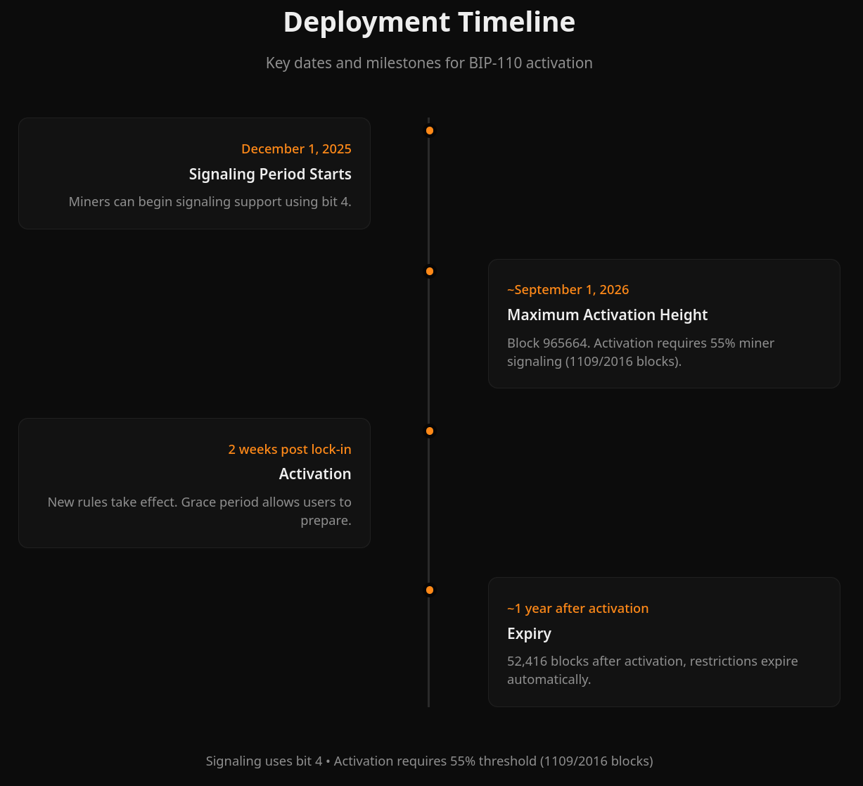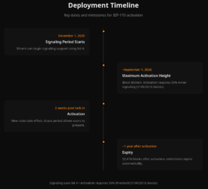 - Señalización: Comienza el 1 de diciembre de 2025. Los mineros que apoyen pueden usar el bit 4 en sus bloques (ponen un «1» en esa posición) para decir: «Yo apoyo el BIP-110».
