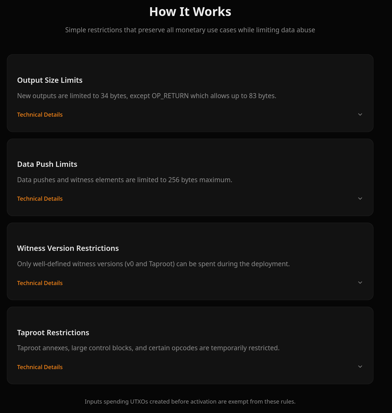 - Qué propone: un soft fork temporal (≈ 1 año) que limita el tamaño de datos no financieros en las transacciones (outputs ≤ 34 bytes, OP_RETURN ≤ 83 bytes, pushes ≤ 256 bytes, entre otras restricciones).